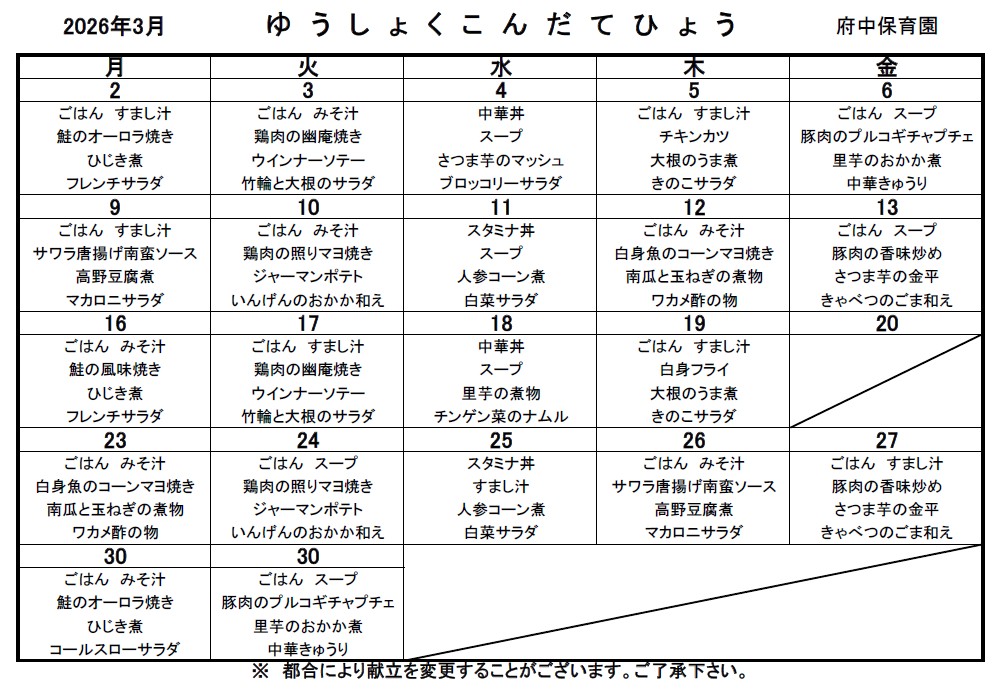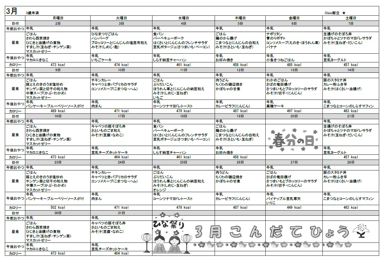 献立表 2026年03月